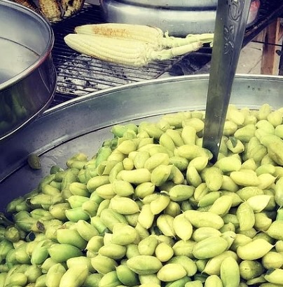 I was reminded of the cerrada San Augustin, a pedestrianized block just below the Morelia Cathedral, lined with snack sellers. On one side, gazpacho stands, colorful heaps of cubed papaya, pineapple, watermelon, mango, ready to fill plastic cups and top with orange juice, lime, chili, cheese, crema — your choice. On the other side, ice cream stands with all the usual plus fabulous flavors like avocado and mamey. A little further down, esquites, roasted corn kernels spiced and sauced 10 different ways, served in a cup, or, at fancier places, in a little clay bowl. A vendor sells elote, roasted corn on the cob (with or without crema, chili, lime, grated cheese). Another offers jicama pops the size of ping pong paddles, ready to coat, or not, in sugar or chili or both. A guy hawks the ever-popular Dorilocos, a bag of Doritos zipped open on the side, for stuffing with, you guessed it, salsa, cheese, lime. Then there are snack bags of garbanzos, beans in skins or not, roasted or steamed. Another corner, sugar- or Hershey chocolate-dipped fried churros.